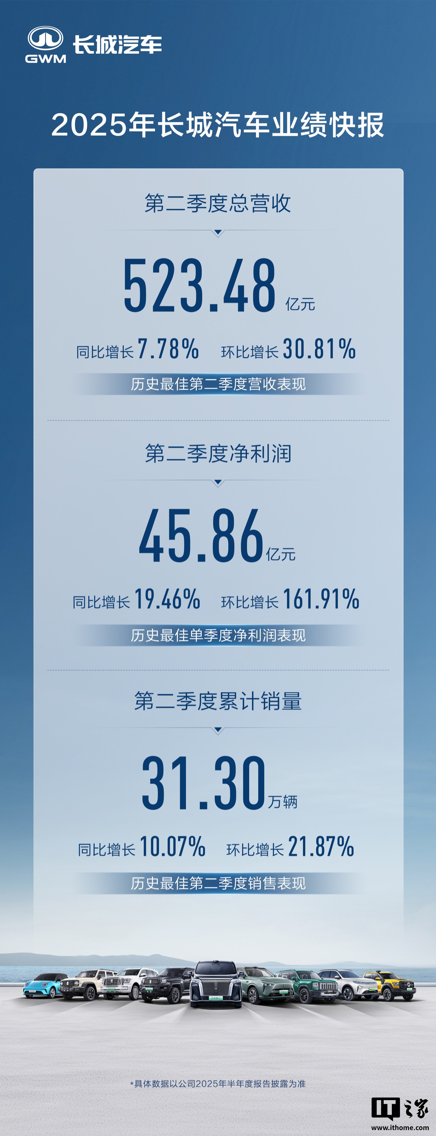 另外,长城汽车 2025 年二季度净利润 45.86 亿元,同比提升 19.46%、环比提升 161.91%;二季度销量 31.30 万辆,同比增长 10.07%、环比增长 21.87%。